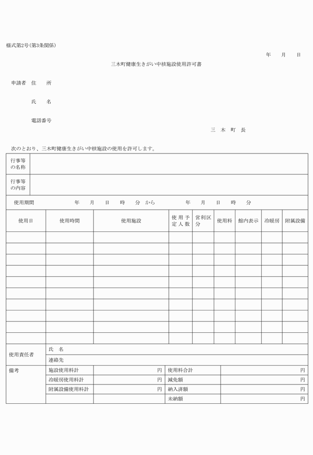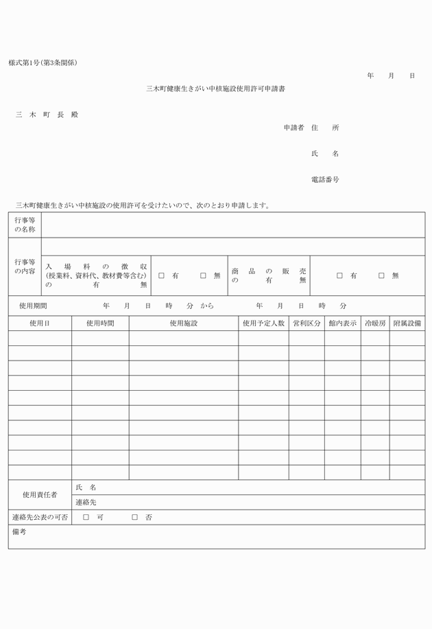 第3条 施設を使用しようとする者(以下「申請者」という。)は、三木町健康生きがい中核施設使用許可申請書(様式第1号)を町長に提出し、許可を受けなければならない。