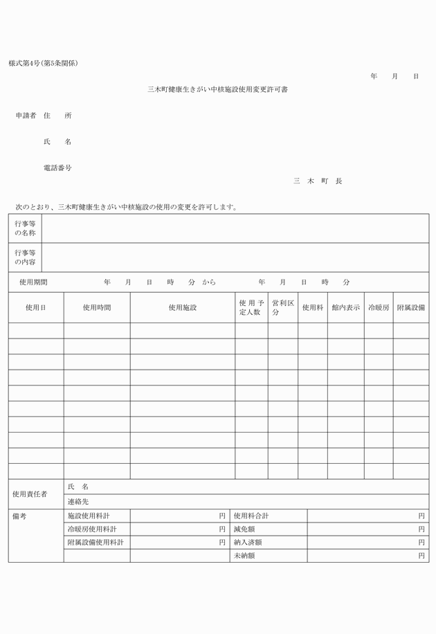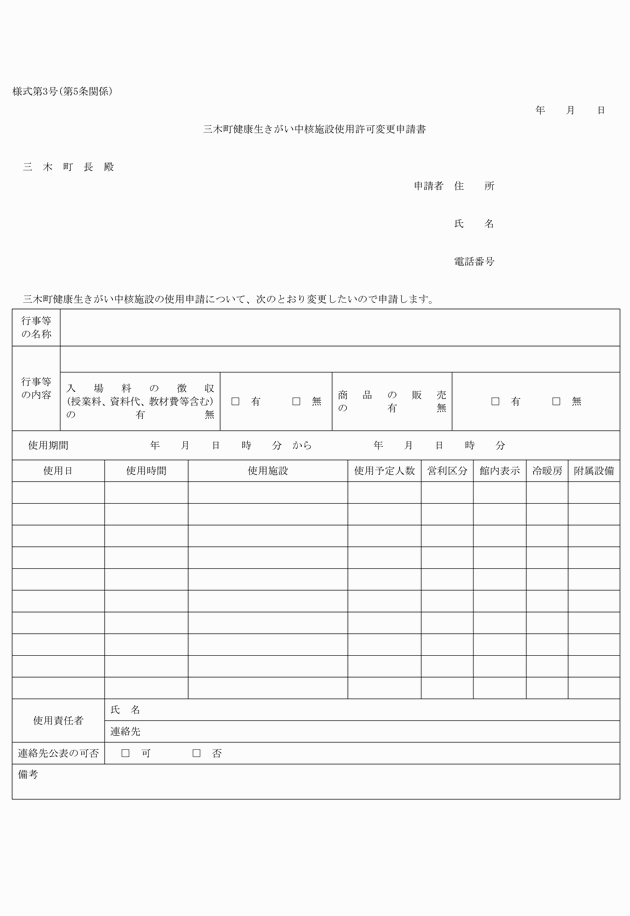 第5条 使用者が、変更の許可(以下「変更許可」という。)を受けようとするときは、三木町健康生きがい中核施設使用許可変更申請書(様式第3号)を町長に提出しなければならない。