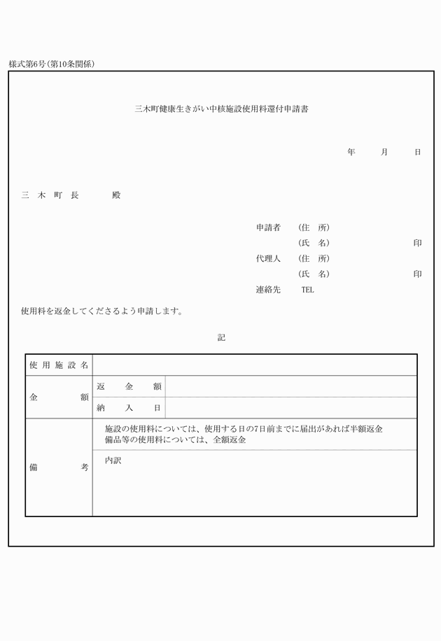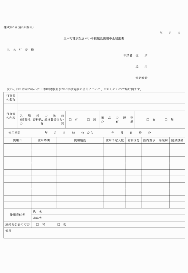 第6条 使用者は、施設の使用を中止しようとするときは、三木町健康生きがい中核施設使用中止届出書(様式第5号)を町長に提出しなければならない。