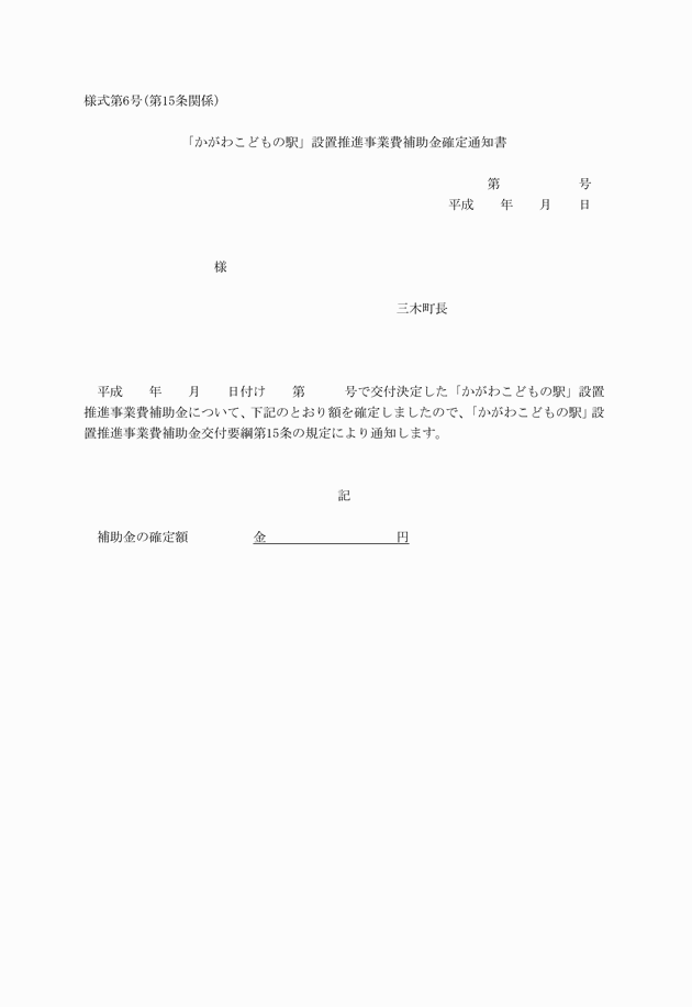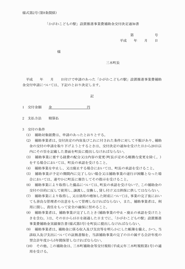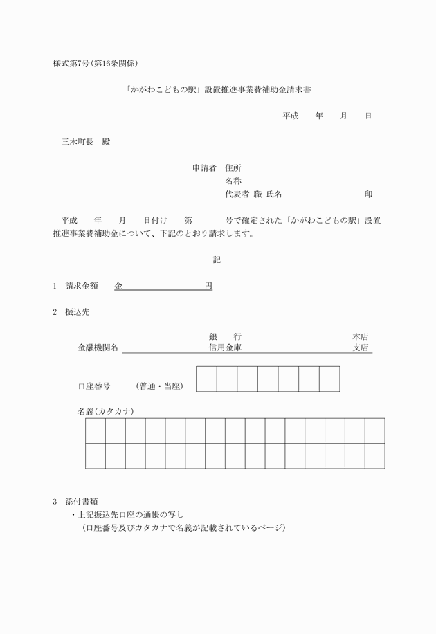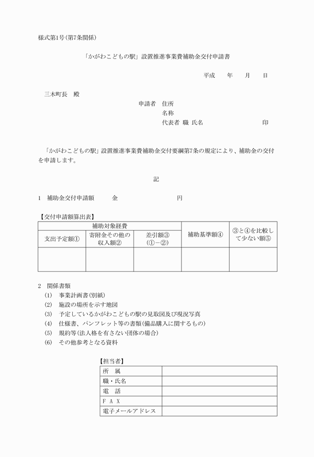 第7条 法人等が補助金の交付を受けようとするときは、「かがわこどもの駅」設置推進事業費補助金交付申請書(様式第1号)を町長に提出しなければならない。なお、その提出期限は別に定める。