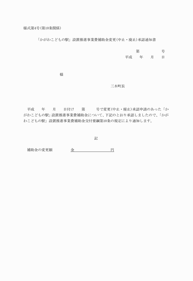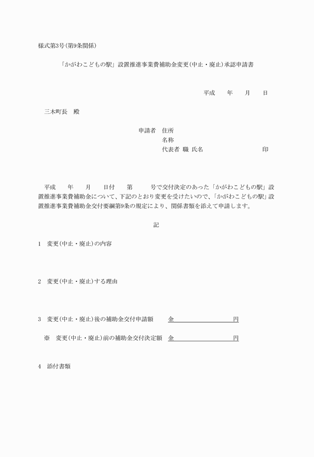 第9条 補助事業者は、事業の内容に係る変更等(軽微な変更は除く。)の承認を受けようとするときは、「かがわこどもの駅」設置推進事業費補助金変更(中止・廃止)承認申請書(様式第3号)を町長に提出しなければならない。