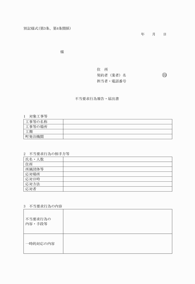第3条 契約者は、建設工事等の契約の履行に当たり、暴力団等から不当要求行為を受けたときは、町に報告するとともに、警察署に届け出なければならない。この場合における報告書及び届出書は、別記様式によるものとする。