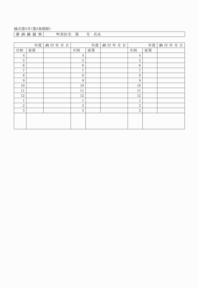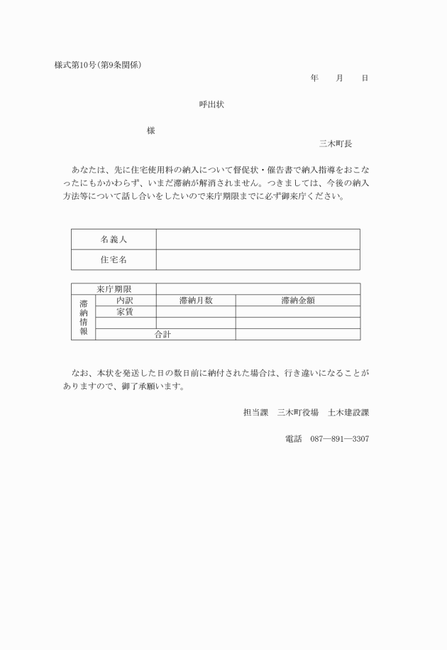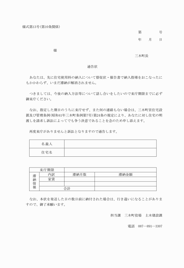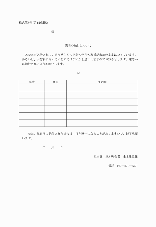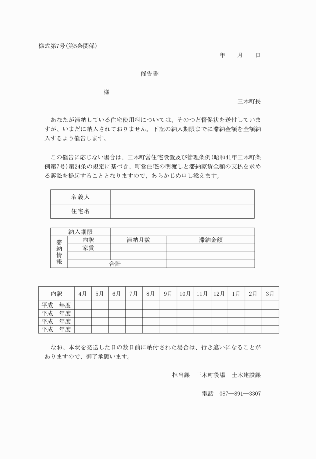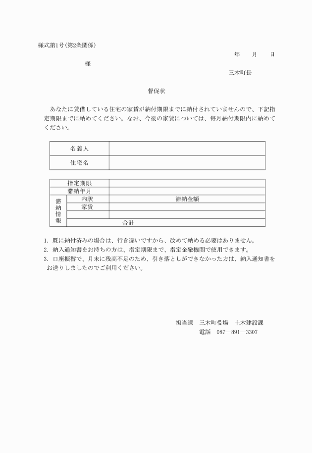 第2条 家賃を納付期限までに納付しない者があるときは、納期限の属する月の翌月の20日までに督促状(様式第1号)を発行する。