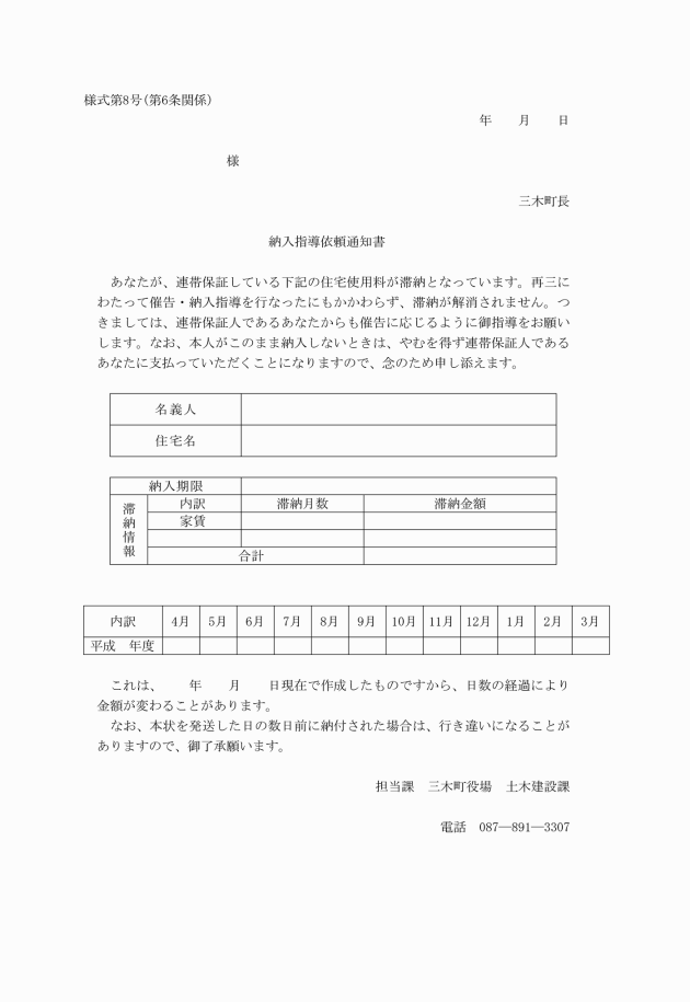 第6条 滞納家賃が6か月以上の滞納者の保証人又は連帯保証人に対して、納入指導依頼通知書(様式第8号)により納付履行の協力を依頼する。