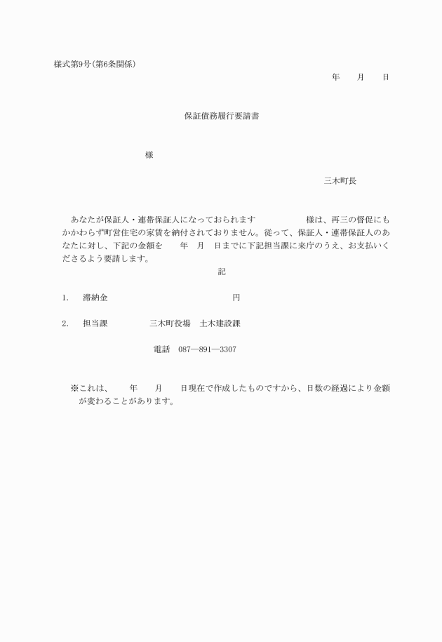 2 滞納月数が12か月以上の滞納者の保証人及び連帯保証人に対しては、保証債務履行要請書(様式第9号)により保証債務の履行を要請する。