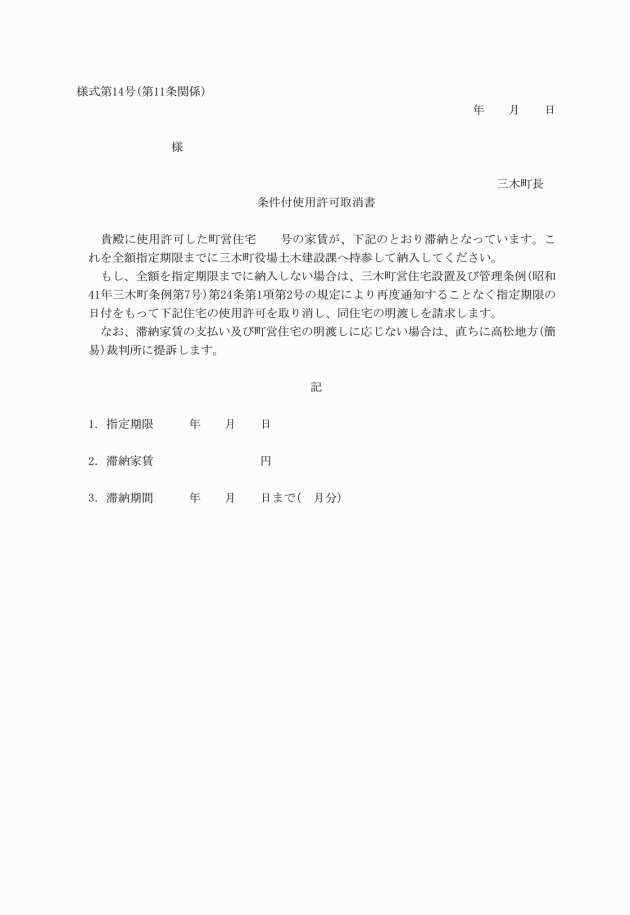 第14条 前条第2項により法定期限内に異議の申立てをする者に対しては、法的措置を採るものとし、町営住宅明渡請求及び滞納家賃支払請求(以下「町営住宅明渡し等請求」という。)の提訴の議案を議会へ提出する。