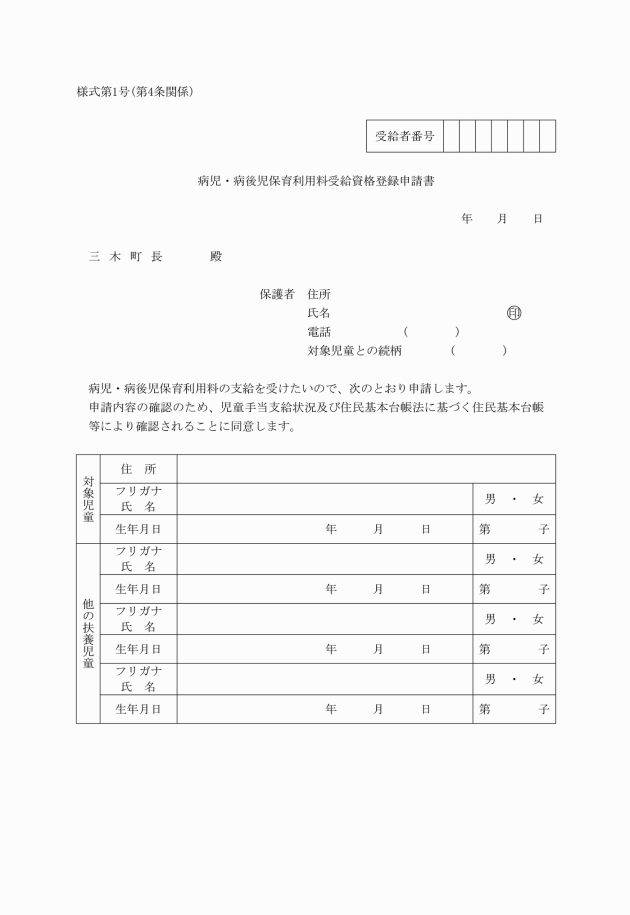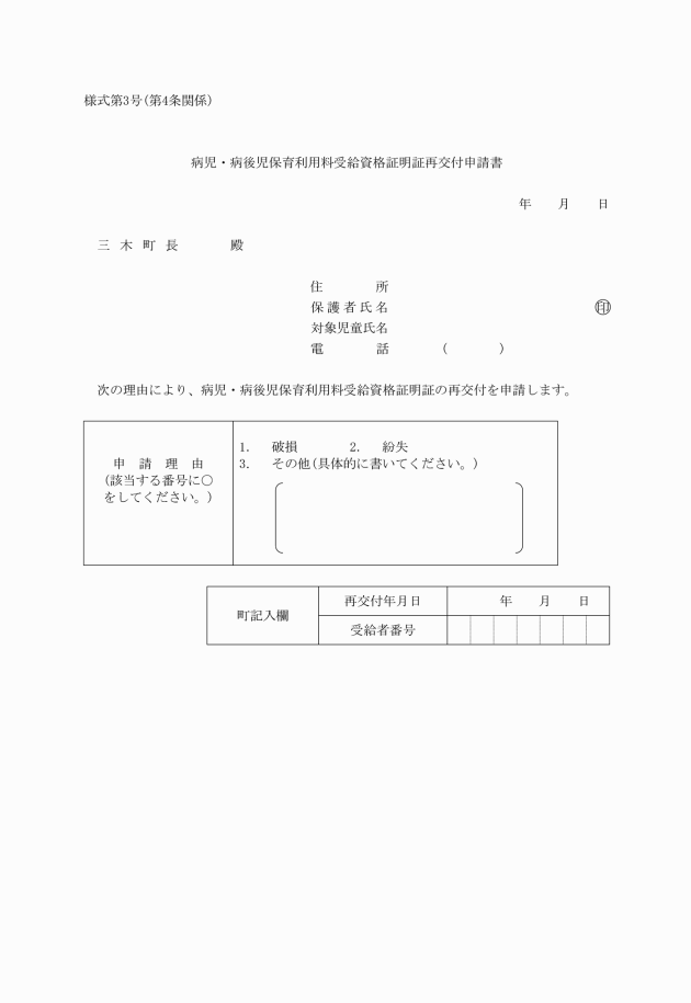 3 証明証を破損又は紛失したときは、病児・病後児保育利用料受給資格証明証再交付申請書(様式第3号)を町長に提出し、再交付を受けることができる。