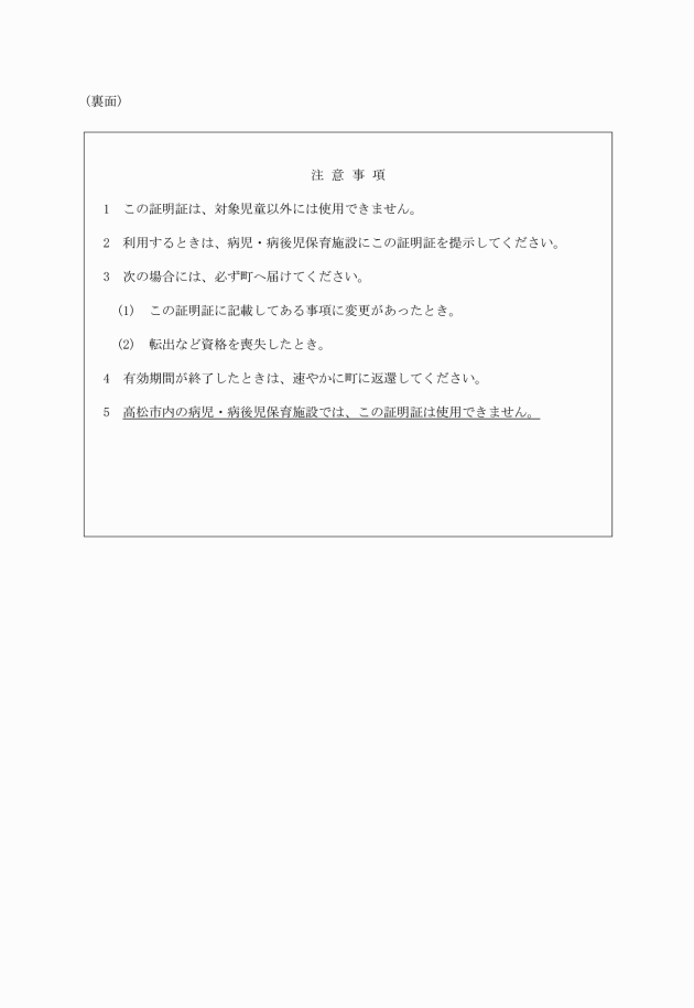第5条 保護者は、対象児童が病児・病後児保育を利用するときは、病児・病後児保育施設に証明証を提示しなければならない。