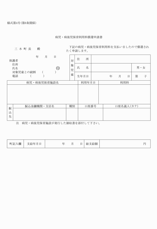 第6条 町長は、対象児童の利用料を、当該保護者に代わり、当該病児・病後児保育施設に支払うものとする。