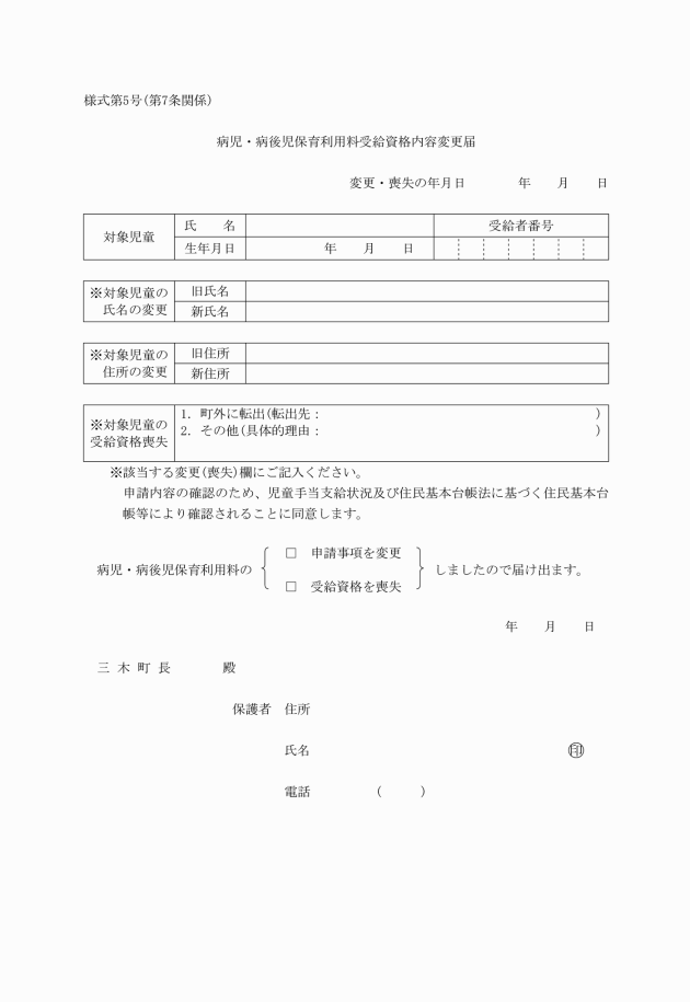 第7条 保護者は、証明証に記載している事項について変更があったときは、速やかに病児・病後児保育利用料免除資格内容変更届(様式第5号)を町長に提出しなければならない。