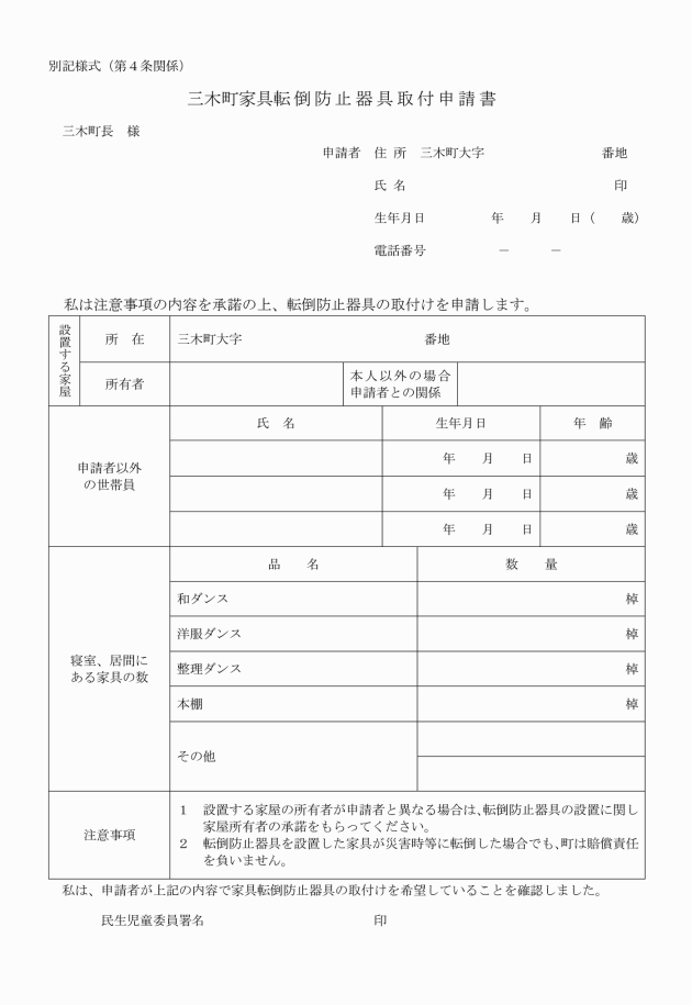 第2条 三木町家具転倒防止器具取付事業(以下「事業」という。)は、地震防災対策として、住居の中で利用頻度の高い寝室及び居間の家具等に別表で定める家具転倒防止器具を無償で取り付けるものとする。